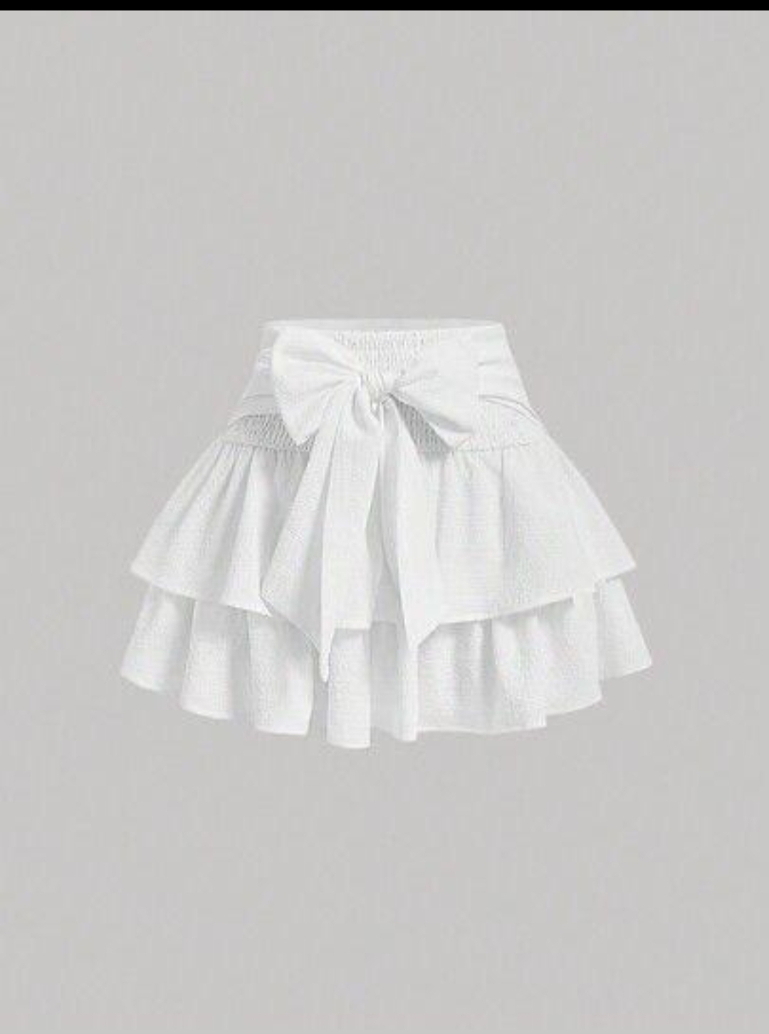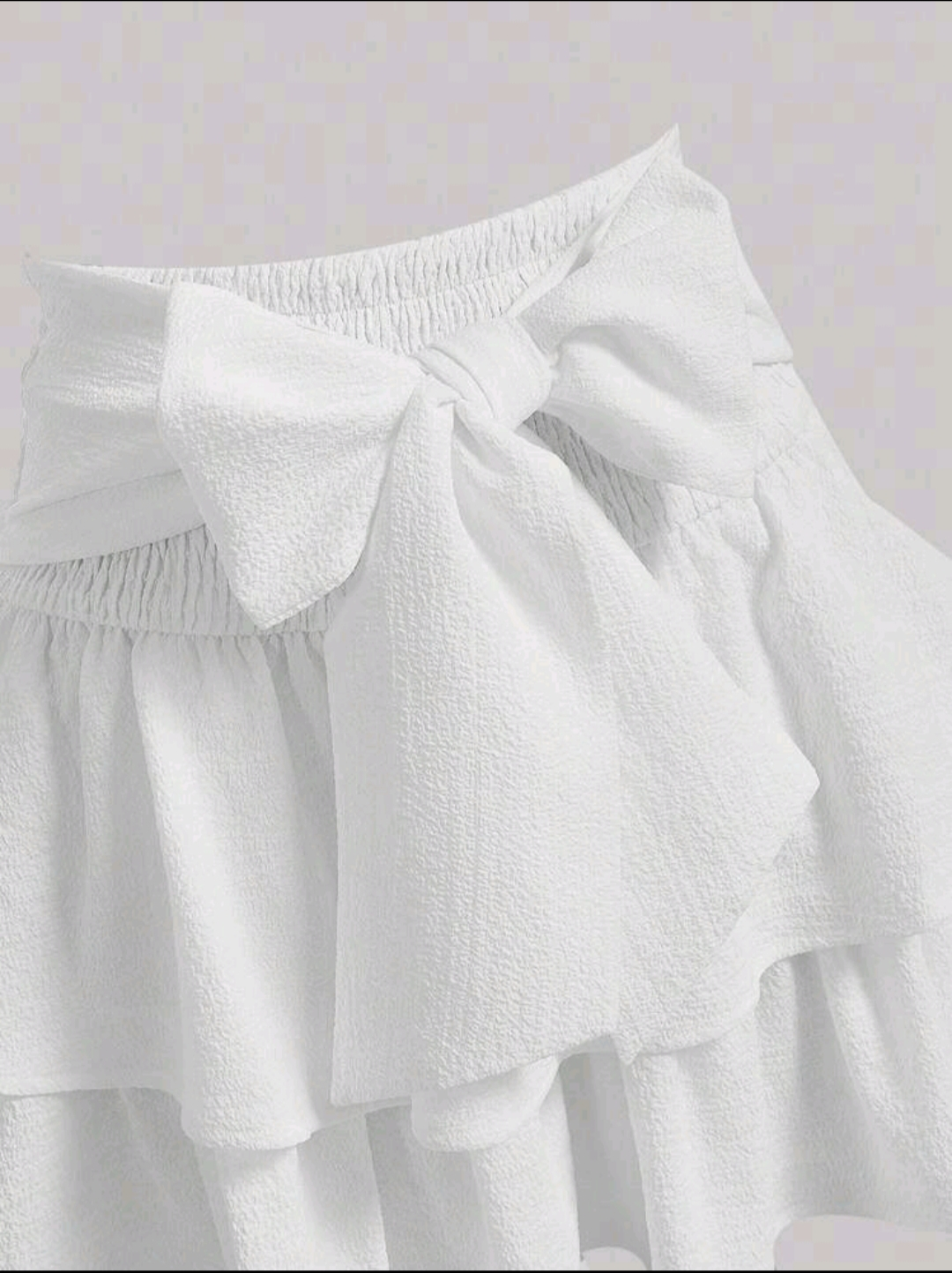 جيبة قصيرة أنيقة باللون الأبيض، مصممة بطبقتين كلوشة (كشكشة) تضيف لمسة أنثوية مرحة.الخصر عالي ومطاطي لراحة أكبر، مزين بربطة كبيرة من نفس القماش .