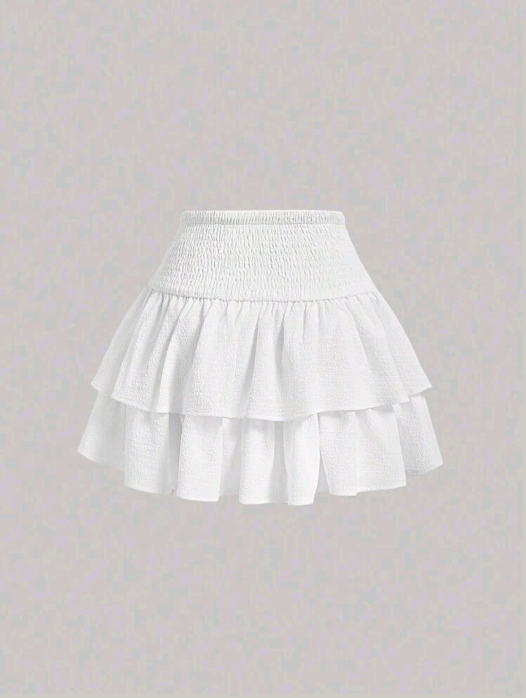جيبة قصيرة أنيقة باللون الأبيض، مصممة بطبقتين كلوشة (كشكشة) تضيف لمسة أنثوية مرحة.