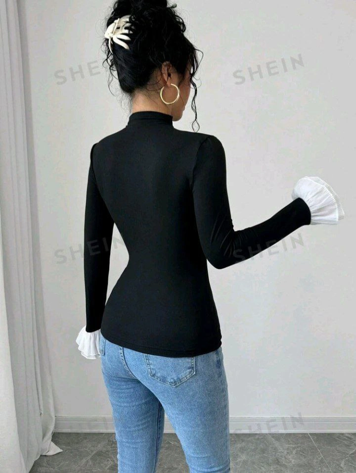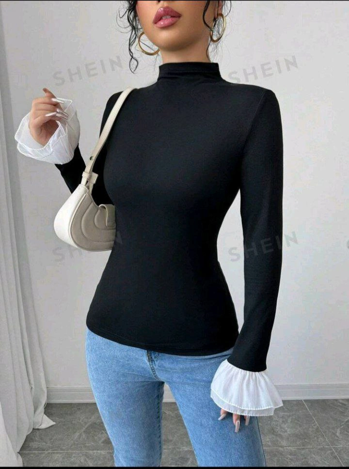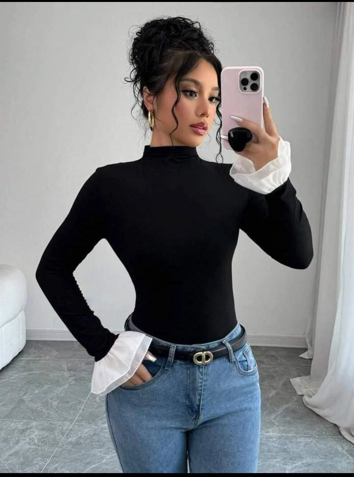 بلوزة أنيقة للسيدات مناسبة لفصلي الربيع والخريف، تتميز بتصميم عصري يجمع بين الأناقة والراحة. البلوزة تأتي بياقة مرتفعة (Mock Neck) تضيف لمسة من الرقي، وأكمام واسعة على شكل جرس تضفي حيوية وأناقة مميزة. التصميم بلونين متناسقين (Color-Block) يمنحها مظهراً عصرياً وجذاباً، بينما القصة الضيقة (Fitted) تعزز من إبراز قوام الجسم بشكل أنيق.