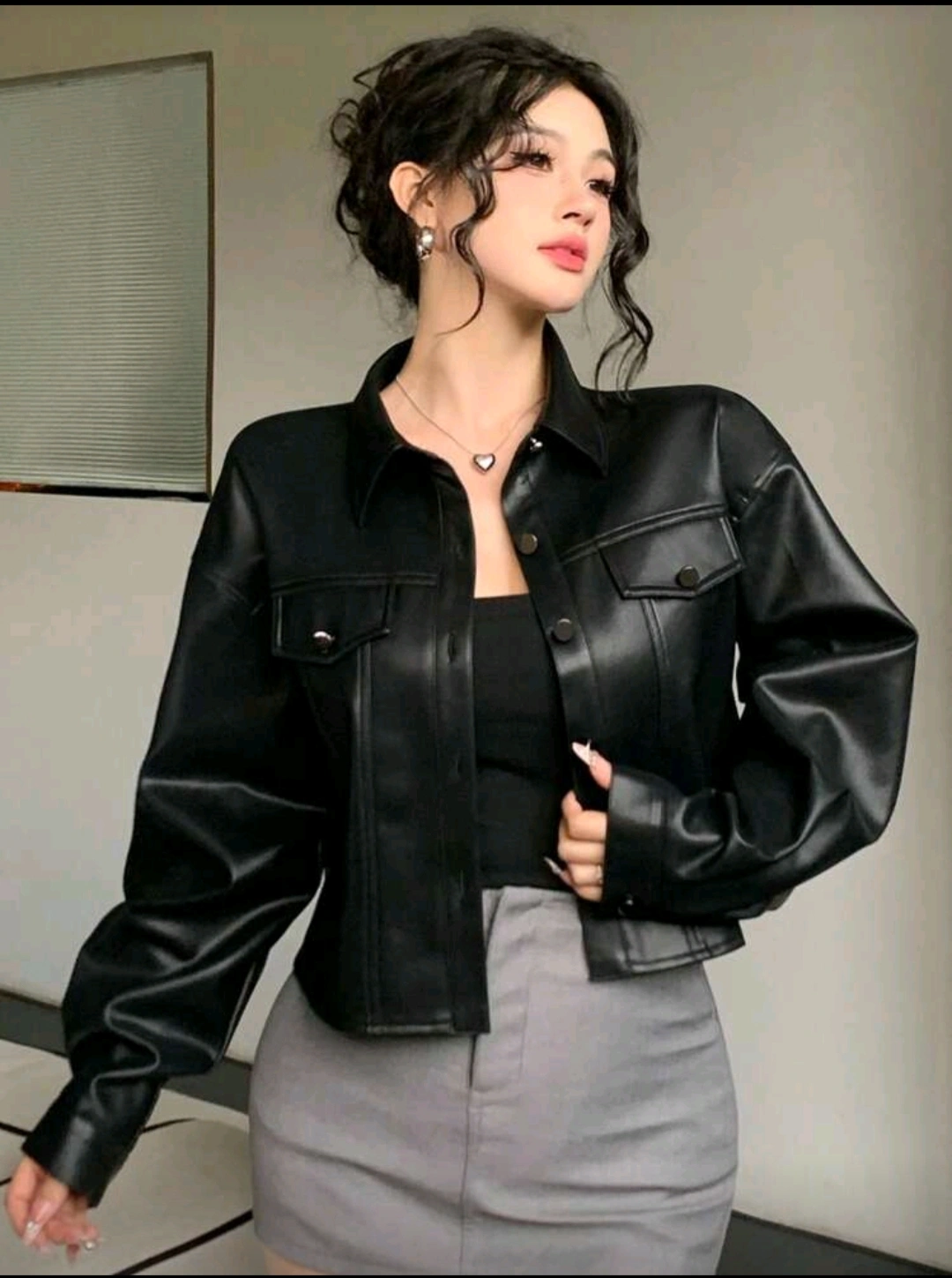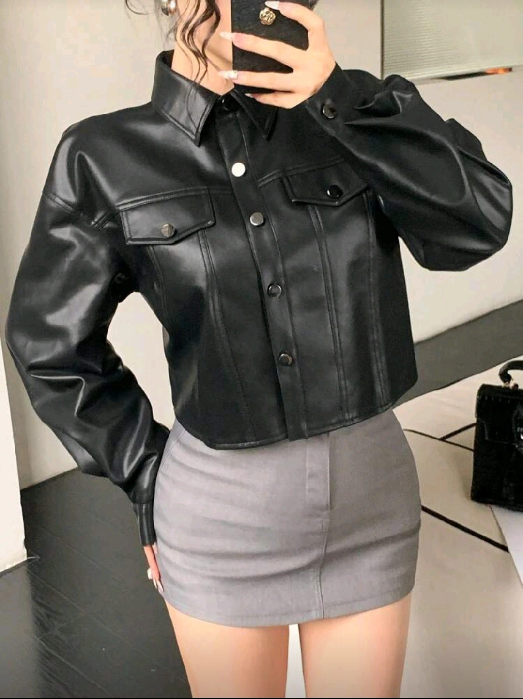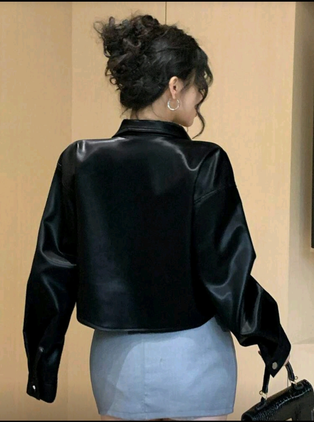 تميّزي بإطلالة تجمع بين الفخامة والأناقة العصرية مع هذا الجاكيت القصير من الجلد الصناعي باللون الأسود اللامع.