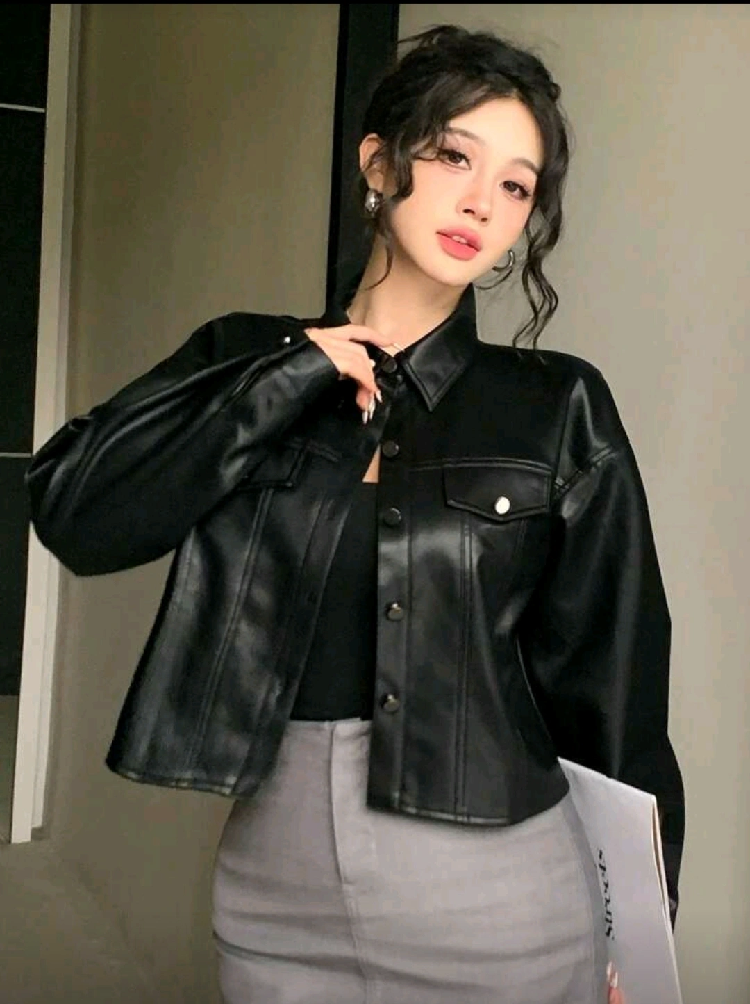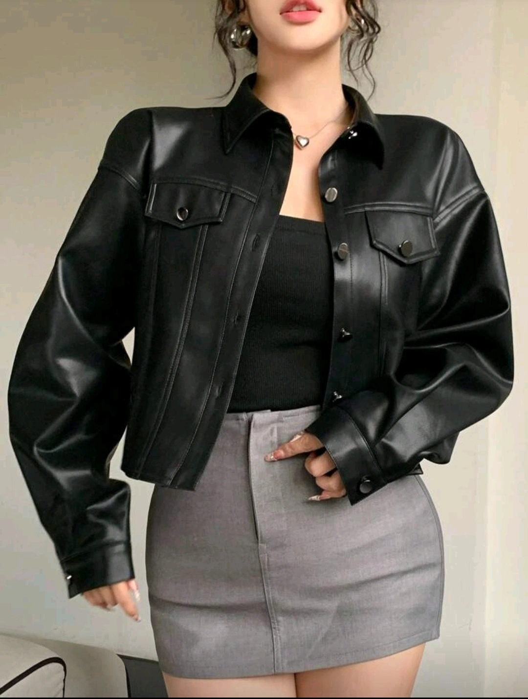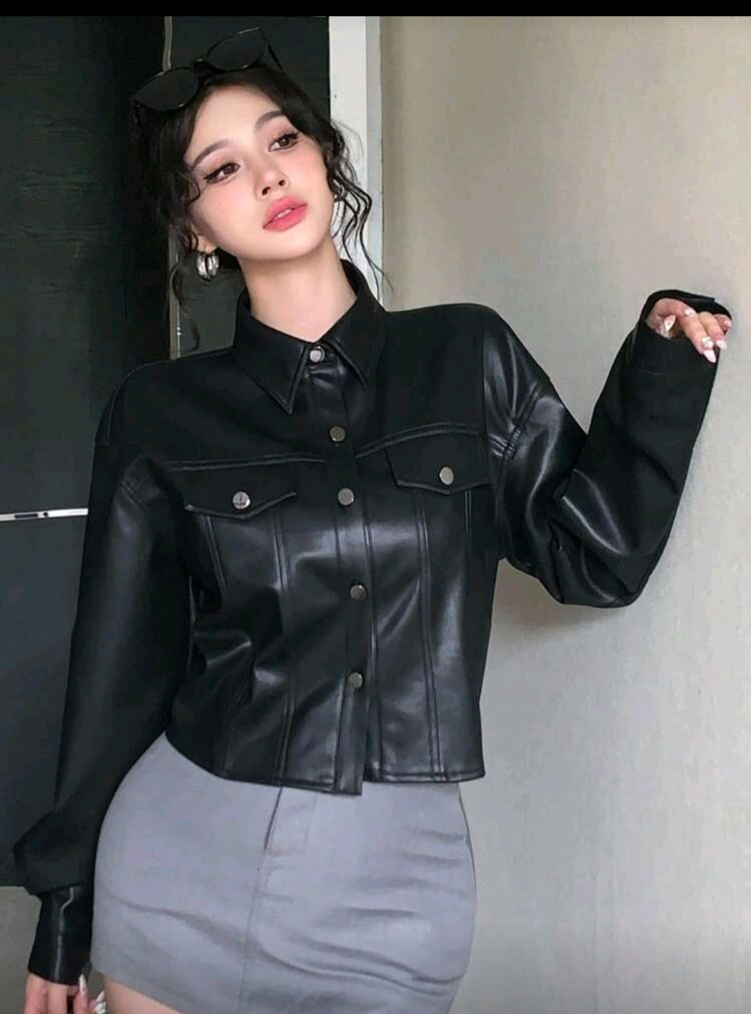 تميّزي بإطلالة تجمع بين الفخامة والأناقة العصرية مع هذا الجاكيت القصير من الجلد الصناعي باللون الأسود اللامع.