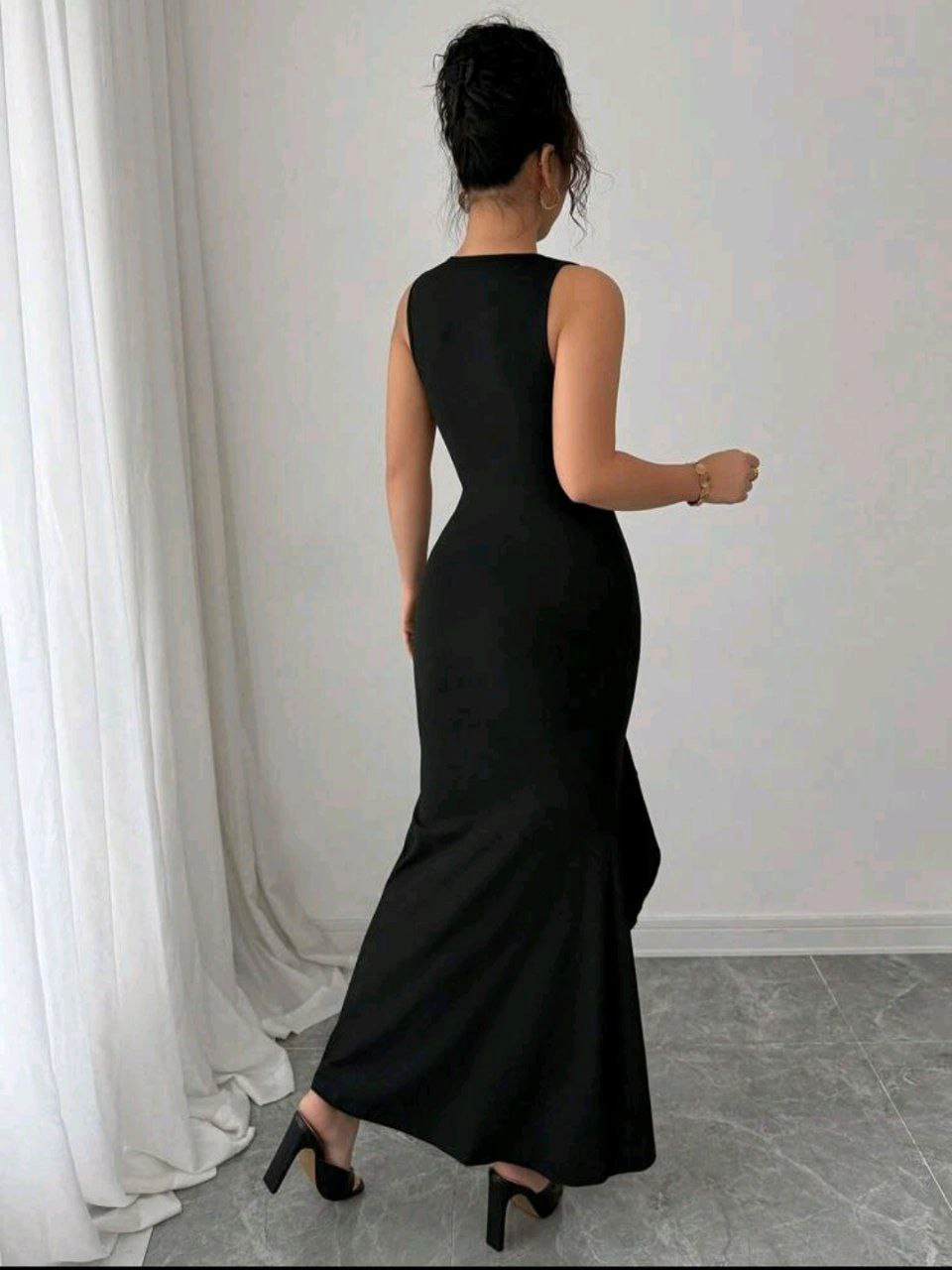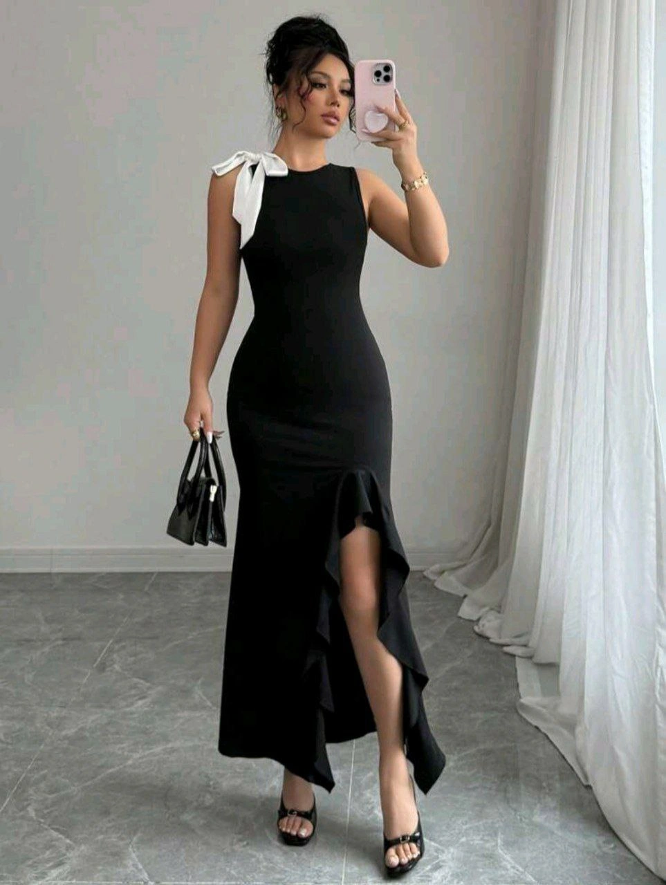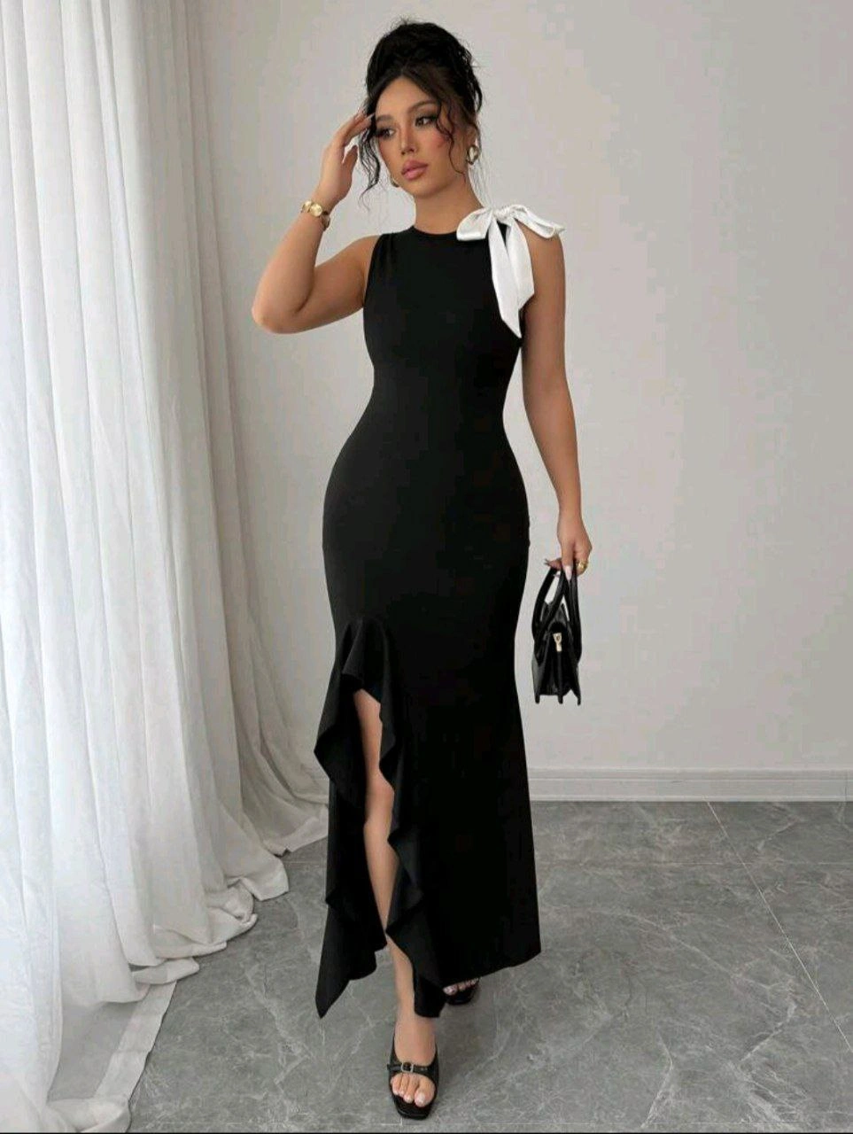 فستان سهرة أسود فاخر بقصة ضيقة تبرز جمال القوام.