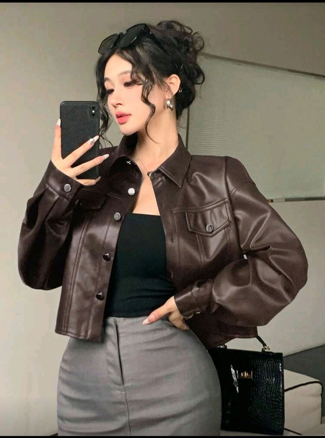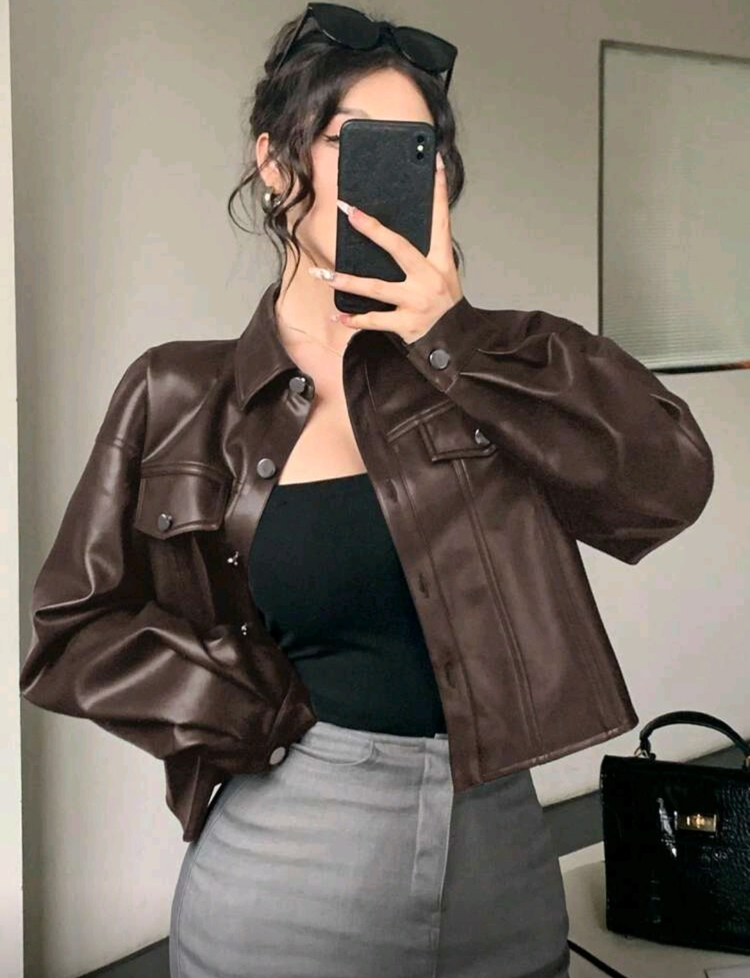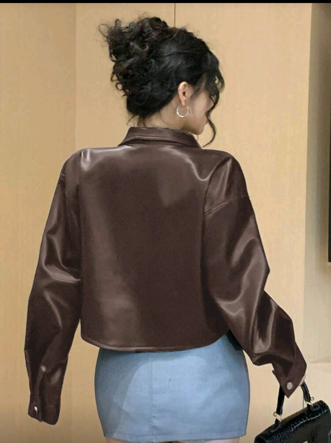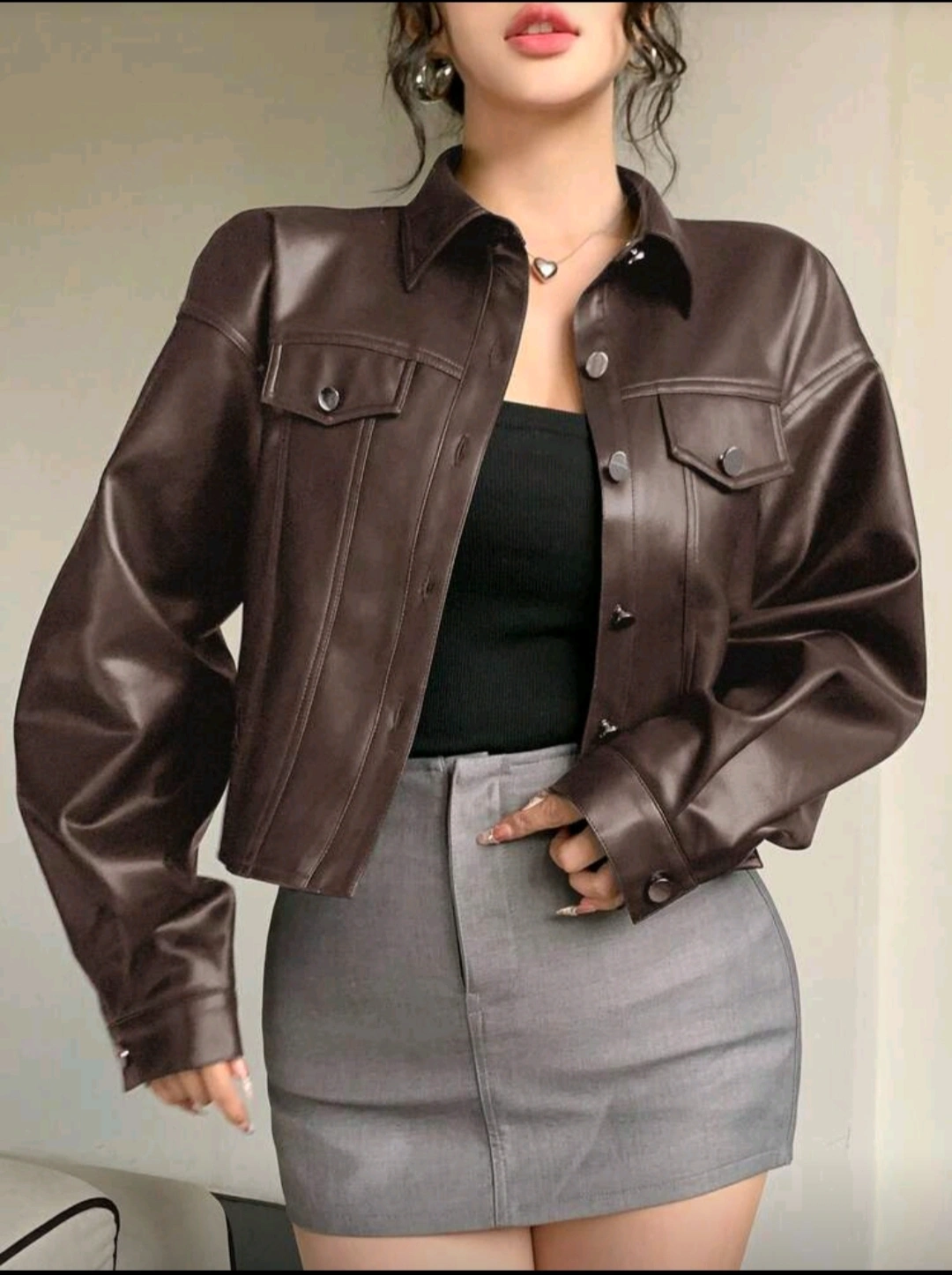 أضيفي لمسة من الأناقة الجريئة إلى إطلالتك مع هذا الجاكيت القصير من الجلد الصناعي الفاخر باللون البني الداكن.