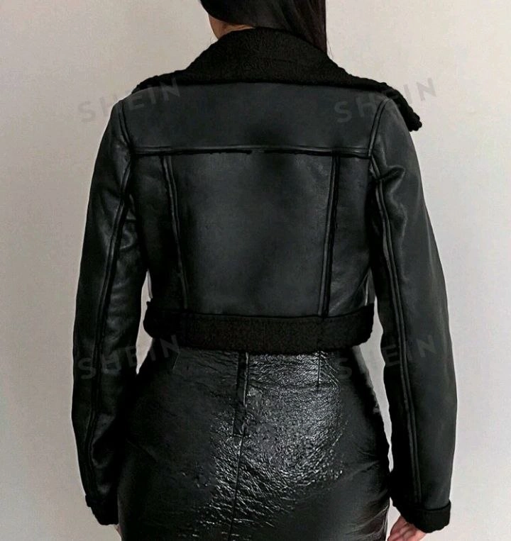 تصميم أنثوي وأنيق: جاكت جلد باللون الأسود المميز بتفاصيل مكتكة تضيف لمسة فريدة من الفخامة والرقي.