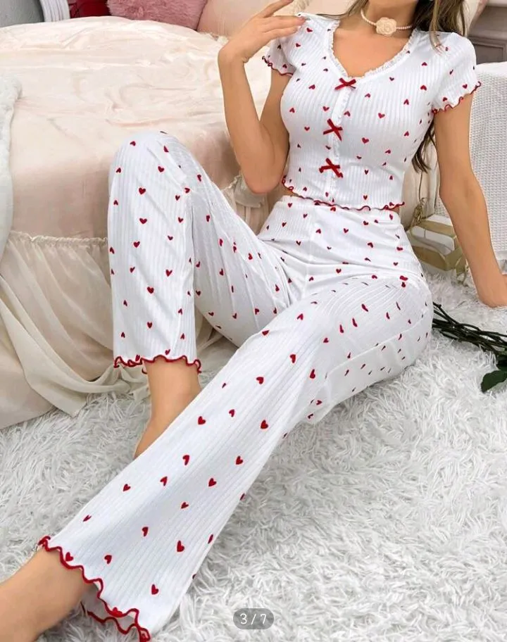 بجامة أنيقة مصنوعة من خامة الجاكار الفاخرة، تتميز بلمستها الناعمة وتصميمها العصري. القطعة الأولى تأتي بلون أساسي جذاب مزين بقلوب سوداء صغيرة تضيف لمسة رومانسية وراقية. القطعة الثانية بلون مختلف متناسق، مزينة بقلوب حمراء نابضة بالحياة، مما يمنح البجامة توازناً مثالياً بين الأناقة والجاذبية.