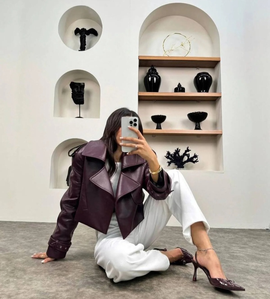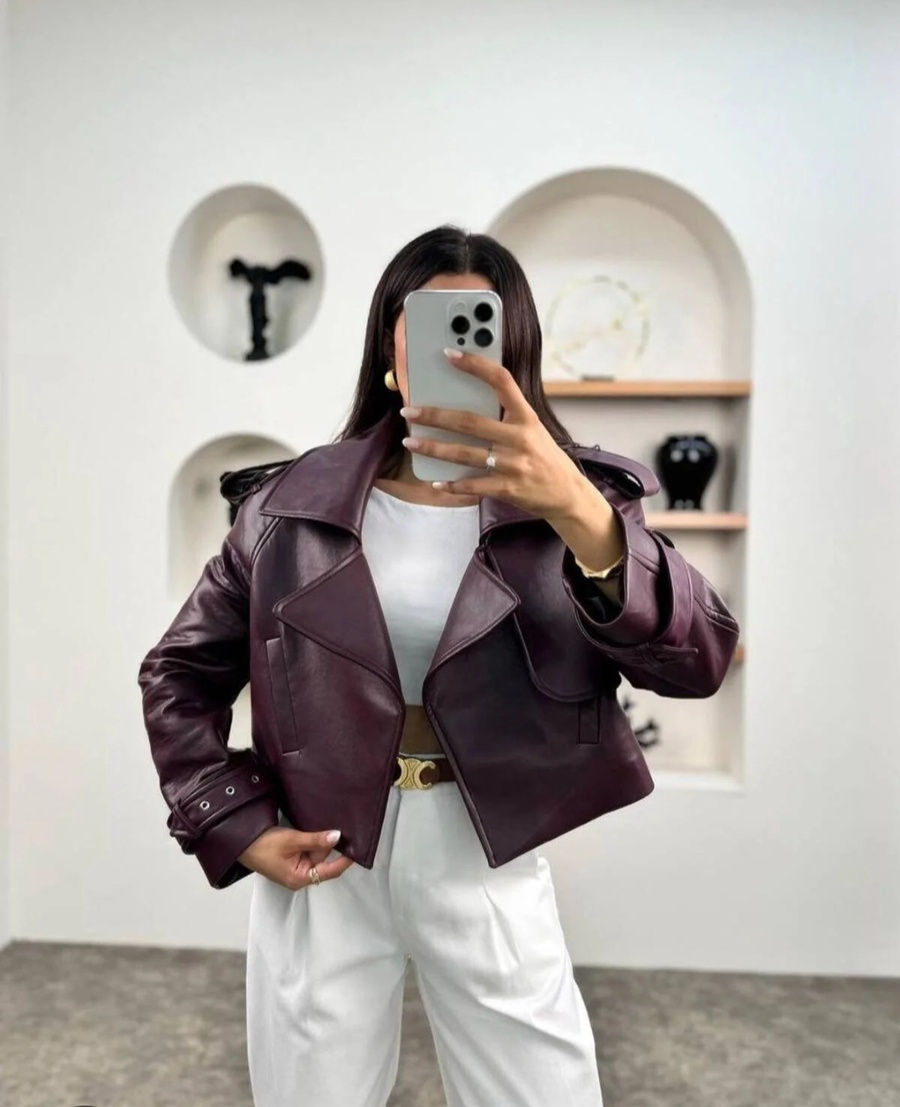 ارتقي بإطلالتك مع هذا الجاكيت القصير الأنيق من الجلد الفاخر باللون البرجاندي.